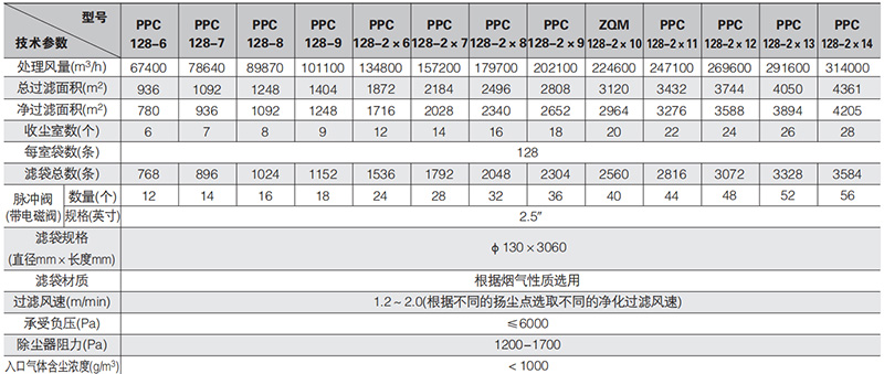 PPC-N×128型氣箱式脈沖袋式除塵器技術(shù)性能表